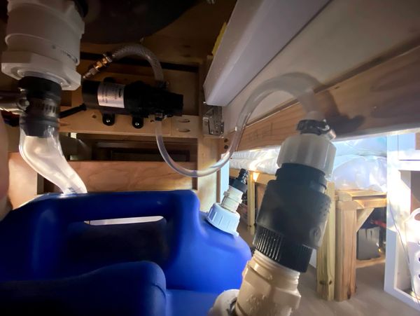 Running water was something that I wished I'd had at the start. After my hand-pump started leaking, it was a good opportunity to upgrade. The electrical wasn't too much work since I already had wire running nearby for the fridge. Luckily, it was heavy enough gauge that I could I just splice into that. I also added some quick disconnects to the water jugs (after several hours wandering around the plumbing aisle at Home Depot).