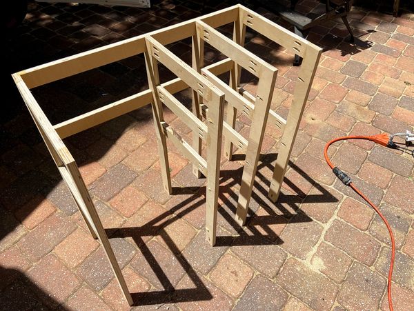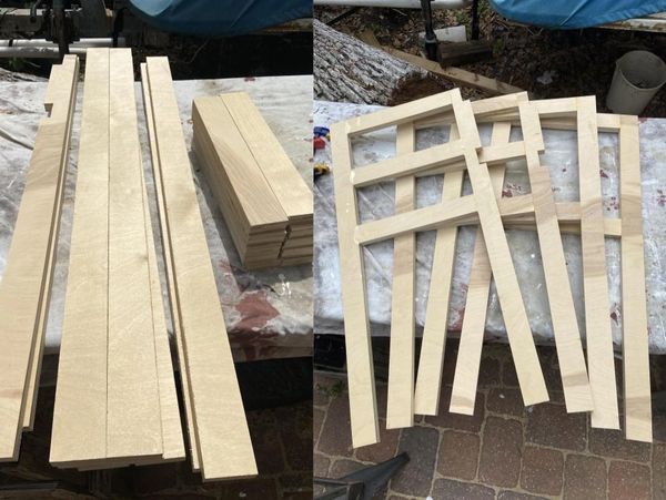I started with 3/4" Baltic Birch plywood. Sketchup has a really cool add-on that prints a list of all the cuts you need to make in your lumber to minimize waste. Lots and lots of drilling on the pocket hole jig, and I had the four partitions of the cabinet.