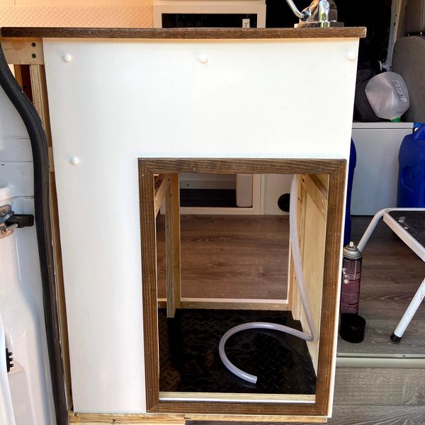 I decided to build the sink cabinet halfway into the opening for the sliding door. This saves tons of space and also gives me a nice view when I'm brushing my teeth. The cabinet fits two six-gallon jugs for fresh water, a one-gallon grey water jug, all my toiletries, garbage can, and cleaning supplies.