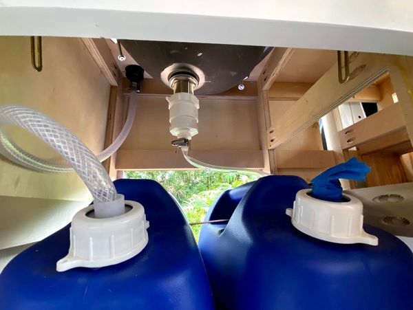 This is version 1 of my fresh water setup. Super basic. The hand-pump faucet started leaking so I decided to upgrade to running water.
